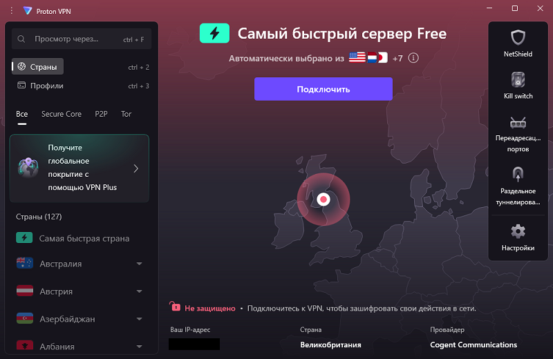 В Proton VPN реализован kill switch. Если VPN внезапно отключится, интернет будет ограничен, пока защита не восстановится. Это предотвращает случайную утечку реального IP.