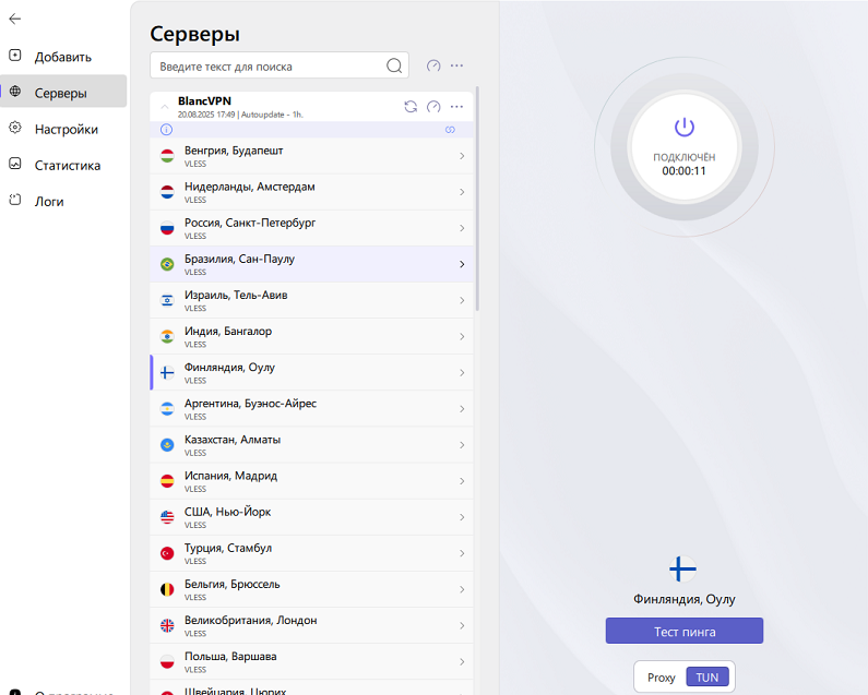 После запуска BlancVPN создаёт защищённый «туннель» между устройством и сервером. Весь интернет-трафик идёт через этот туннель в зашифрованном виде. Программа отображает статус подключения, выбранную страну и тип соединения. Это помогает сразу понять, активен ли VPN и как именно он работает в данный момент.