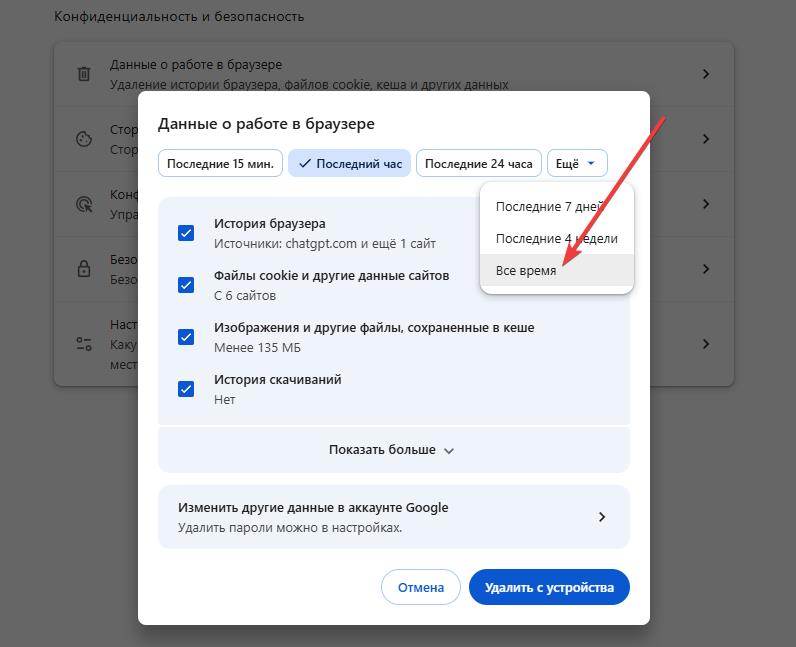 После этого появляется окно удаления данных. Здесь важно выбрать период «За всё время», иначе часть старых файлов останется. Затем отмечаются основные пункты — история просмотров, cookie и кэшированные файлы — и запускается удаление.